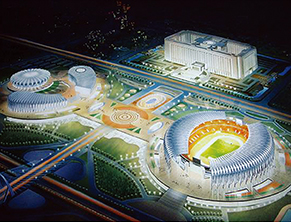 济南奥林匹克体育中心坐落于济南东部新城,北起经十路,南至龙奥北路,东起奥体东路,西至奥体西路,占地81公顷(1215亩),建筑面积35万㎡,总投资概算约50亿元。包括6万座席体育场、1万座席体育馆、4000座席网球馆、4000座席游泳馆以及6万平方米中心区平台广场。